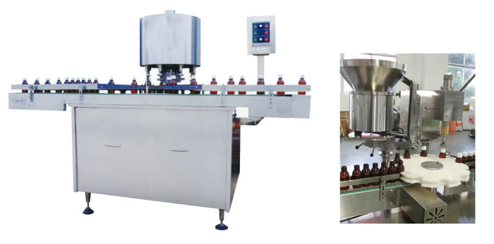 該機符合“GMP”要求,廣泛(fàn)用於(yú)製藥工(gōng)業,能對塑料瓶、玻璃瓶自動完成送瓶、上蓋、旋蓋等動作。體(tǐ)積小,效(xiào)率高,旋蓋質量高。主機采用日本三菱變頻器調速,行星(xīng)式旋(xuán)轉上蓋,可(kě)連(lián)續對(duì)輸送過來的瓶子(zǐ)經氣動裝置夾緊(jǐn)後進行旋蓋。整(zhěng)機噪聲(shēng)小,運轉平(píng)穩,旋蓋不鬆動。調換少數零件可實現多規格玻(bō)璃瓶或塑料瓶旋蓋生產。本機既可單機使用,又可聯入生產線。